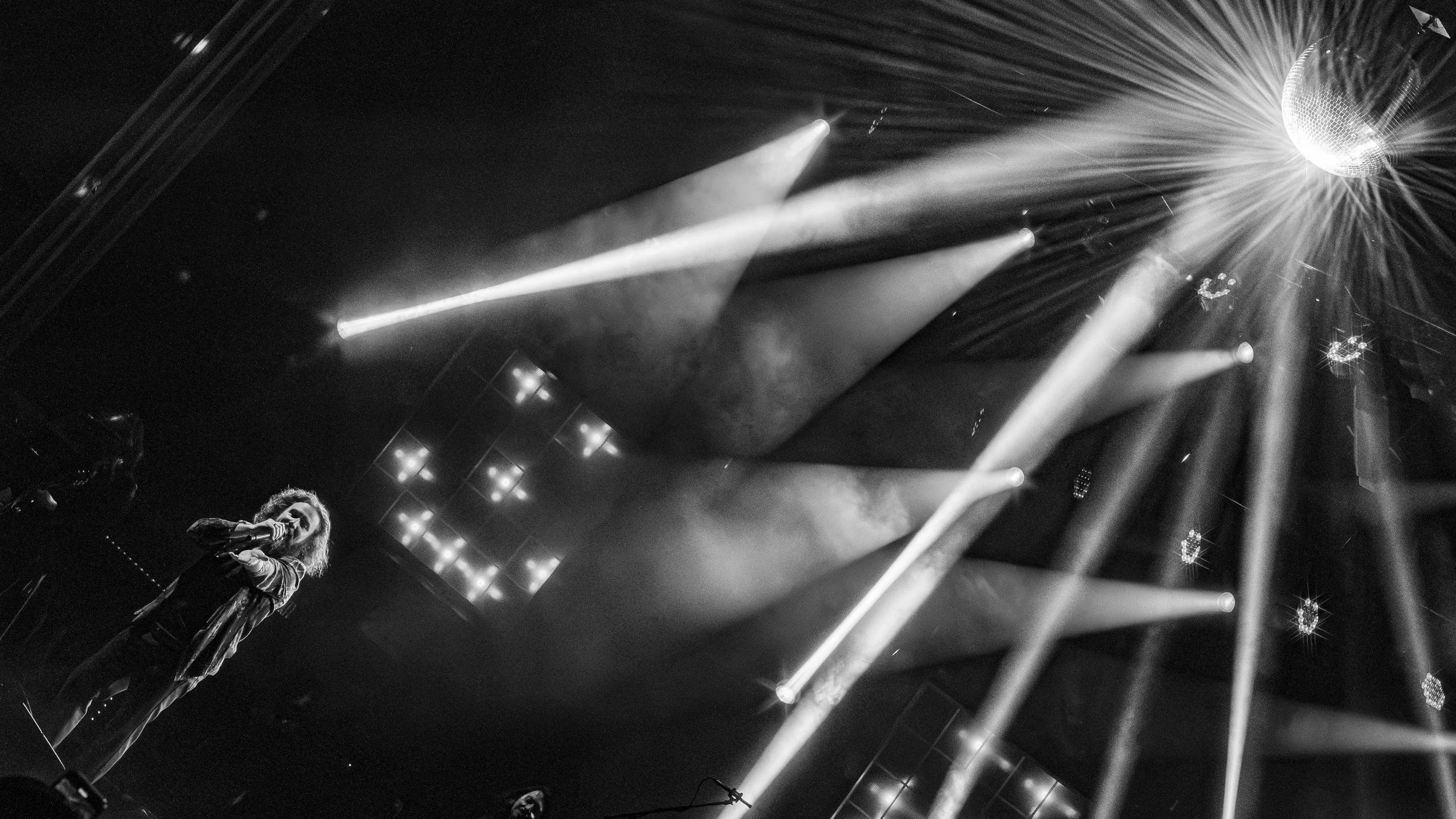 Black and white photo of a male guitarist performing on stage, wearing a sweater with '1939' on it, with a guitar and microphone, under stage lighting.